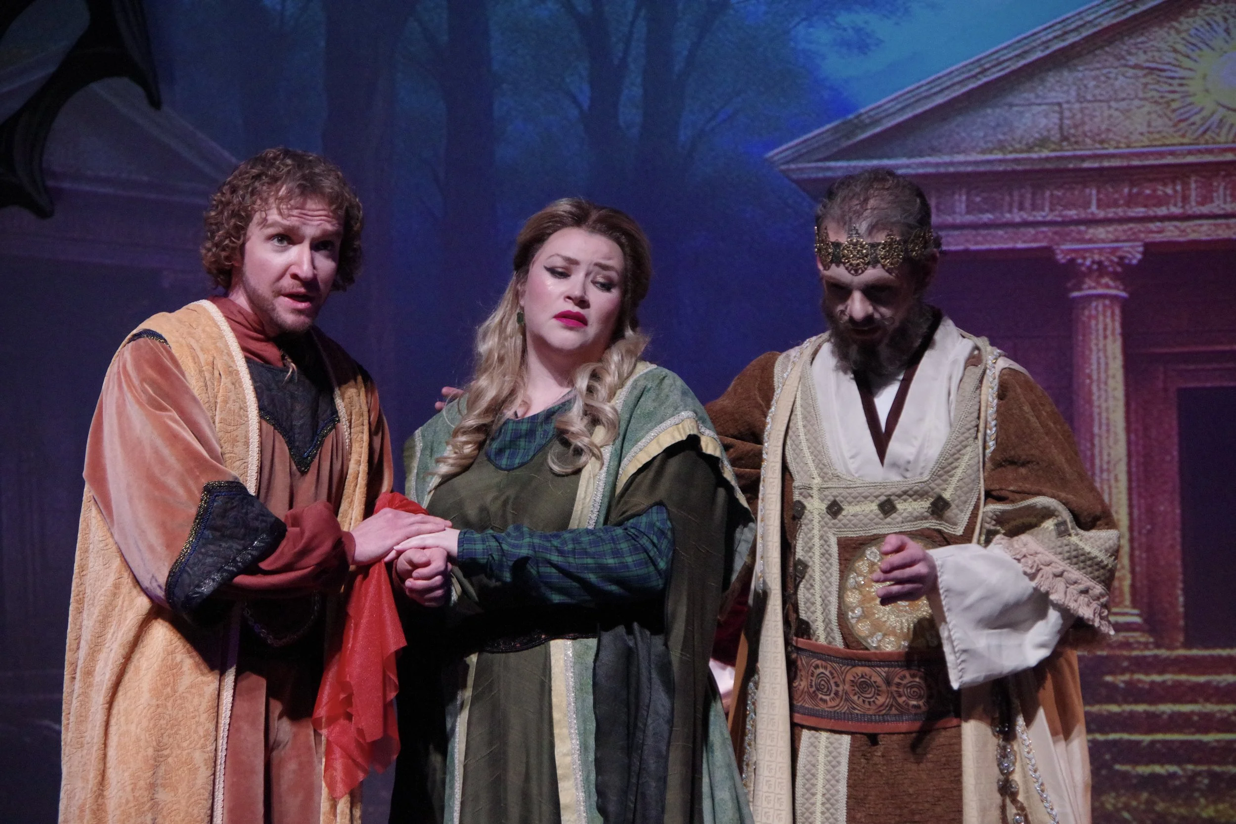 Chelsea Alexandra as Juliet had good French diction and great high overtones in her voice. In general, she navigated Juliet’s first aria “Je veux vivre” well, keeping control of the coloratura throughout and not rushing. This is a voice with a lovely tone… Alexandra’s rendition of the Poison aria later in the show, and the tomb scene, allowed her to show off her acting skills in a highly effective performance that also allowed her to indulge in some satisfying low notes. Not only that, but her duets with McBrayer’s Romeo made for some of the sexiest singing I’ve heard in a while. Part of that is thanks to Gounod’s writing, but there’s no denying that those two voices were well-paired, neither one overpowering the other. ~Maggie Ramsey